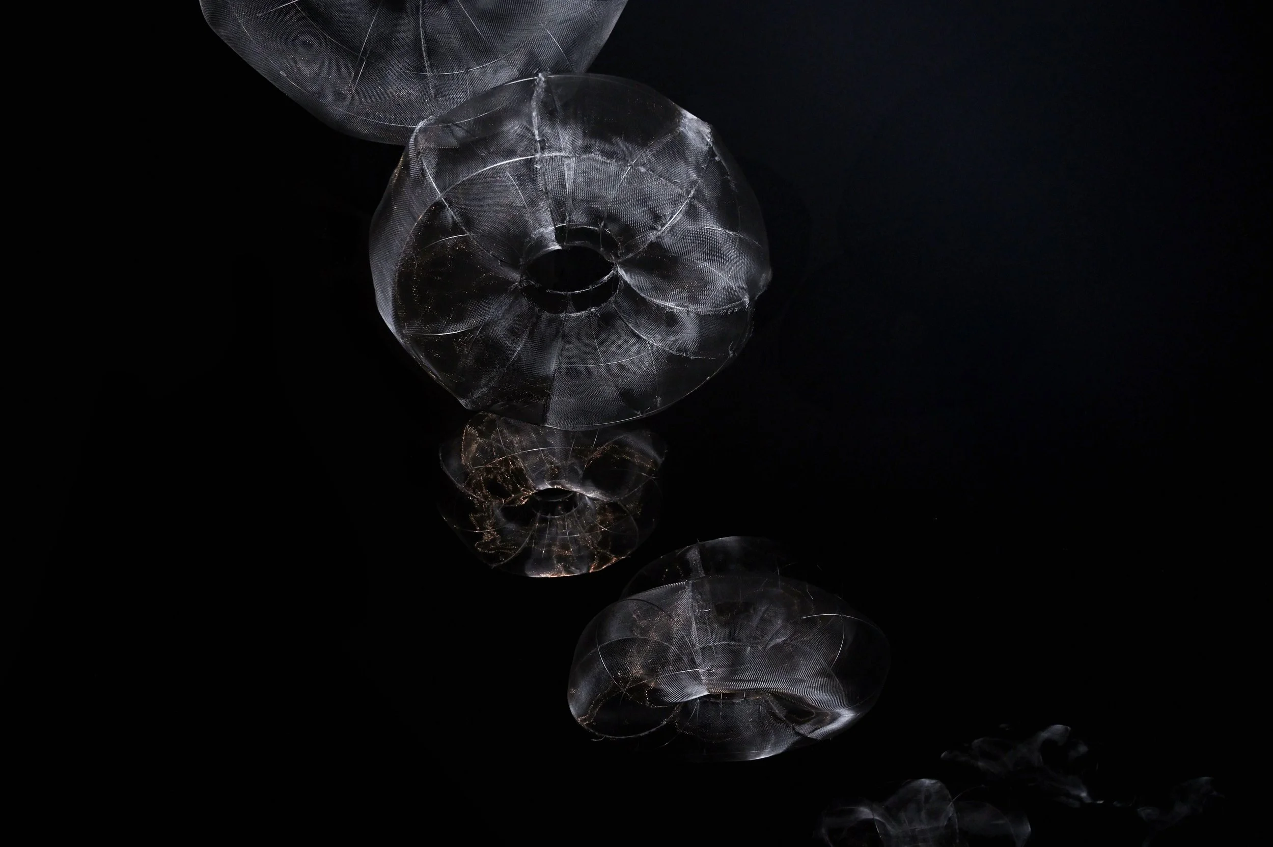 透過材料本身接收光的折射反光特質,讓氣態抑或分子的散落,回應自然間交錯的光點以及孔隙間的呼吸轉換。